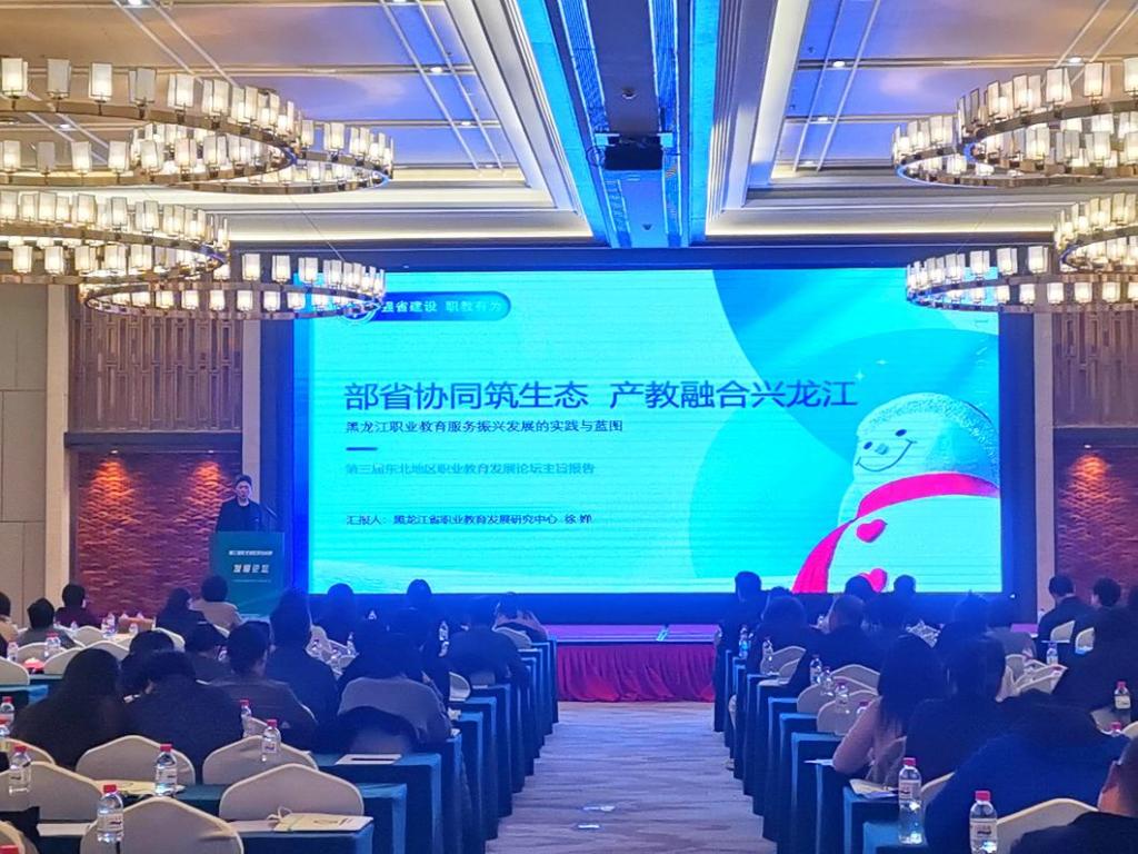 黑龙江省职业教育发展研究中心主任徐婵教授作《部省协同筑生态 产教融合兴龙江——黑龙江职业教育服务振兴发展的实践与蓝图》报告,系统介绍黑龙江省“市域统筹、行业聚集、覆盖全域、对接全链”的三级产教融合体系,阐述如何围绕“定方向、调结构、提效率、强边疆、固基础、探新局”目标,全面落实《哈尔滨倡议》。黑龙江省富锦市职业技术学校党总支书记杨廷玲作《中职学校“四维导向”职普融通育人新模式的研究》报告,聚焦中职教育改革,详细解读“融教师、融学生、融课程、融教法和通管理、通成功”的职普融通实施方案,为中职教育高质量发展提供实践参考。黑龙江农业经济职业学院信息工程系主任柴方艳教授作《汇聚产教合力,培育农村电商人才》报告,立足黑龙江农业资源优势与网络平台经济发展趋势,分享高职教育在电商人才培养与培训中的创新实践,为乡村振兴背景下的职业教育赋能。三项成果报告层层递进,既展现了黑龙江省职业教育发展的理论高度,又呈现了一线实践的深度,为论坛贡献了鲜活的“龙江方案”与“龙江智慧”。