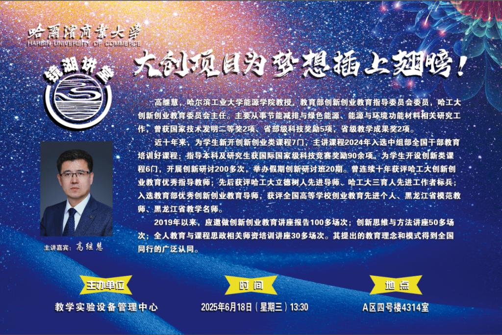 6月18日下午,哈尔滨商业大学“镜湖讲堂”在教学实验设备管理中心4314报告厅开讲。教育部创新创业教育指导委员会委员、哈尔滨工业大学创新创业教育委员会主任、哈尔滨工业大学能源学院高继慧教授受邀作题为《大创项目,为梦想插上翅膀》的专题讲座。学校申报本年度大创项目师生、学院大创项目管理教师、校大学生创新创业联盟成员共200余人参与讲座。教学实验设备管理中心副主任关祥毅主持讲座。