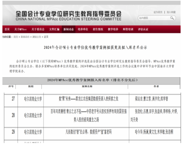 4月24日,全国会计专业学位研究生教育指导委员会公布2024年会计硕士专业学位优秀教学案例评选结果,我院在此次评选中取得佳绩。梁运吉教授团队撰写的教学案例《数“聚”未来——黑龙江农投集团数据资源入表探索之旅》、张劲松教授团队撰写的教学案例《百年风雨兼程青云之志不坠——中药老字号从股权质押布局到国资强势入股的破局重生之路》、哈金华副教授撰写的教学案例《凡拓数创“智”在必得,数据资产“值”富密码》入库中国会计硕士专业学位案例库。