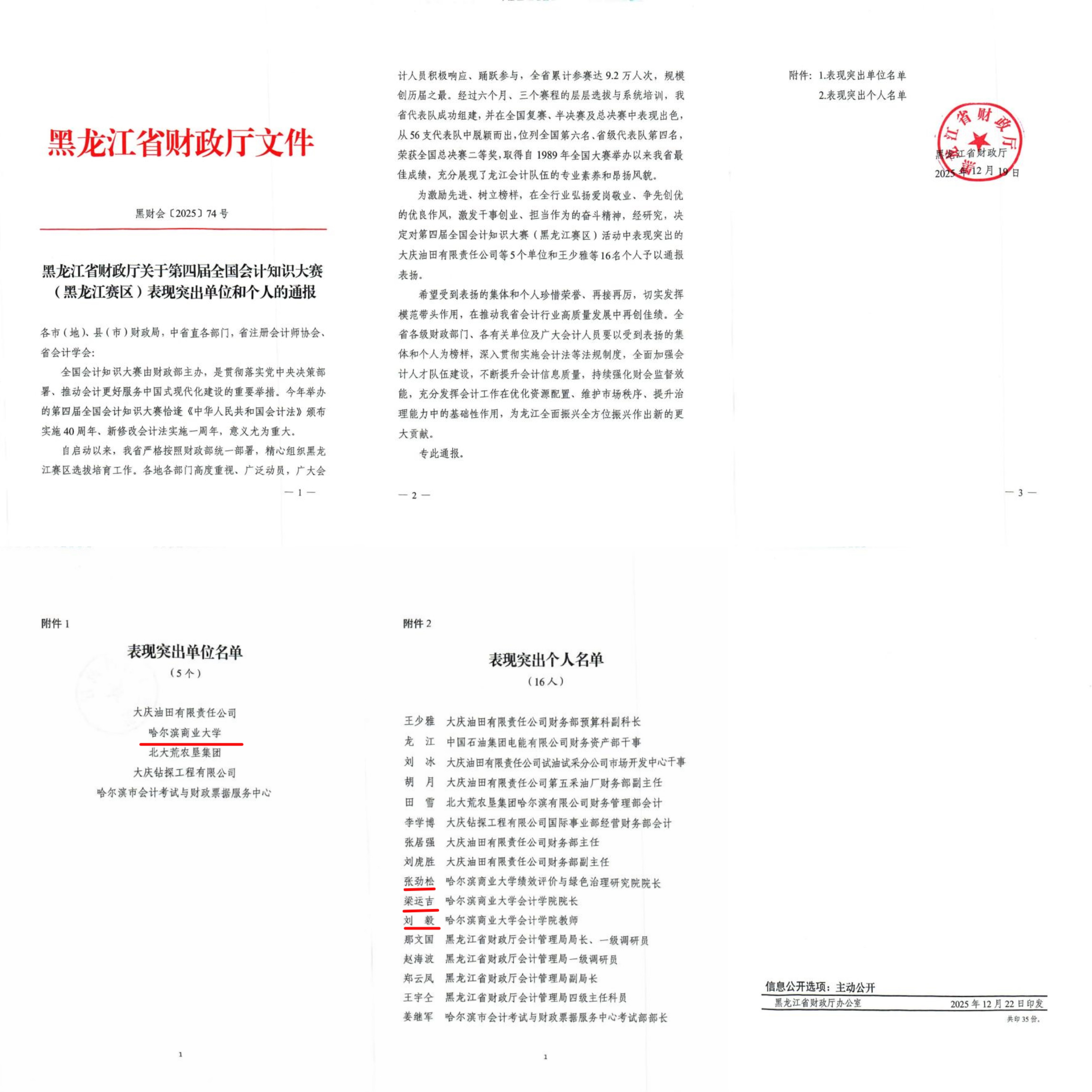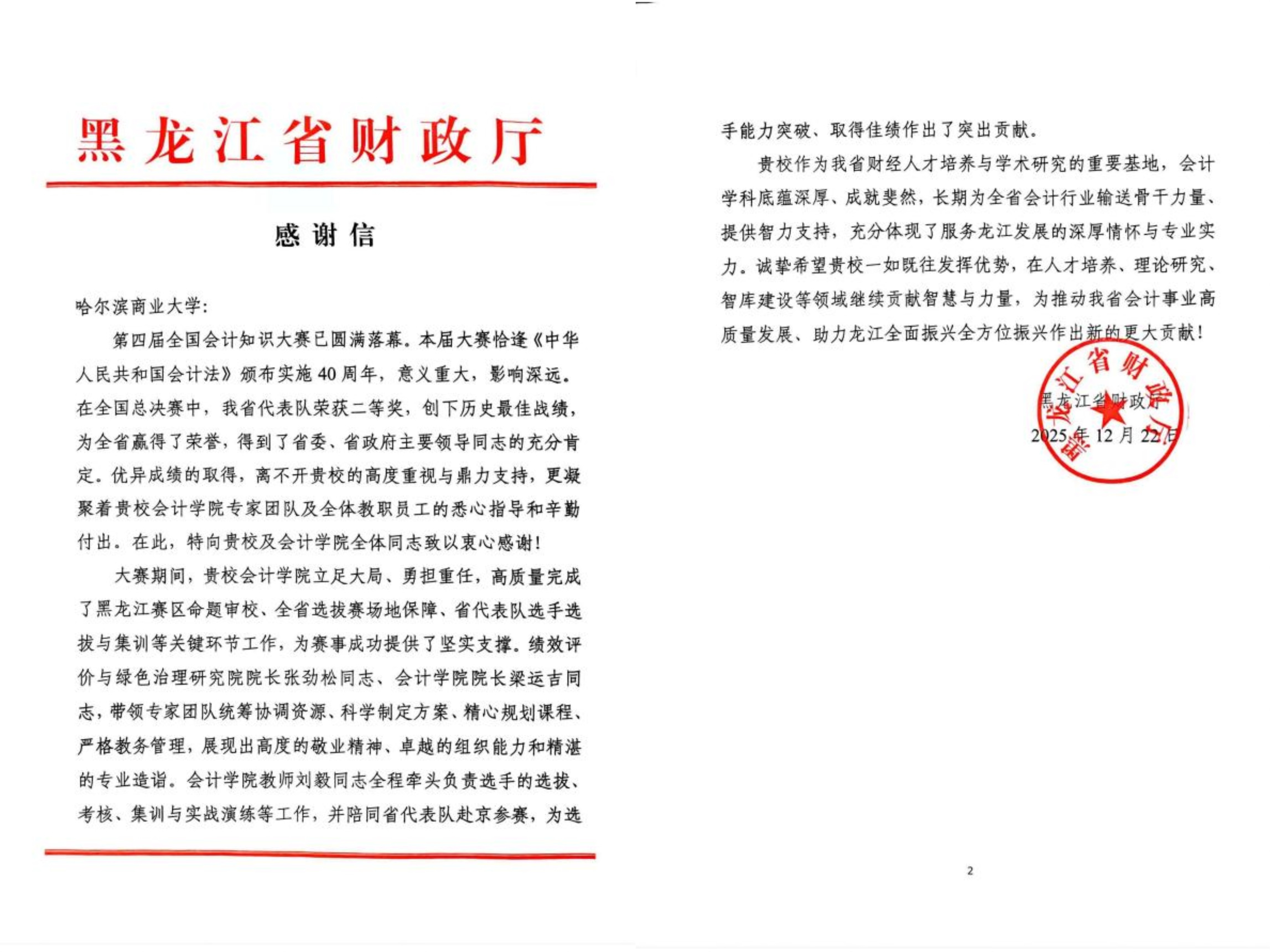 日前,第四届全国会计知识大赛圆满落幕,黑龙江省代表队从全国56支参赛队伍中脱颖而出,斩获全国总决赛二等奖,位列全国第六、省级代表队第四,创下自1989年全国会计知识大赛举办以来我省的历史最佳战绩。12月22日,黑龙江省财政厅发来感谢信并印发通报,对我校在第四届全国会计知识大赛中的卓越贡献给予高度赞誉,学校入选“表现突出单位”,会计学院党委副书记、院长梁运吉和张劲松教授、刘毅老师荣获“表现突出个人”称号。这份荣誉的背后,是学校会计学院立足大局、深耕实干的责任担当,更是学校学科建设、人才培养与社会服务能力的集中彰显。