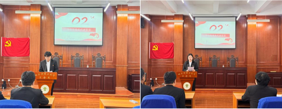 毕业生党员代表王海洋、姜羴同学,分享了自己在党建活动中的蜕变历程。从最初的被关怀者,成长为主动奉献的引领者。他们呼吁同学们以“归零心态”踏入新的岗位,让党员的身份在不懈奋斗中熠熠生辉。