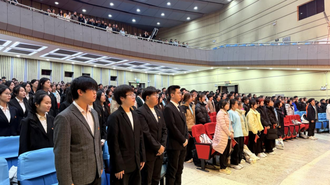 大会在庄严的国歌声中拉开帷幕。全体师生高唱国歌,激昂的旋律回荡在会场,彰显了经济学院师生深厚的爱国情怀和昂扬的精神风貌。
