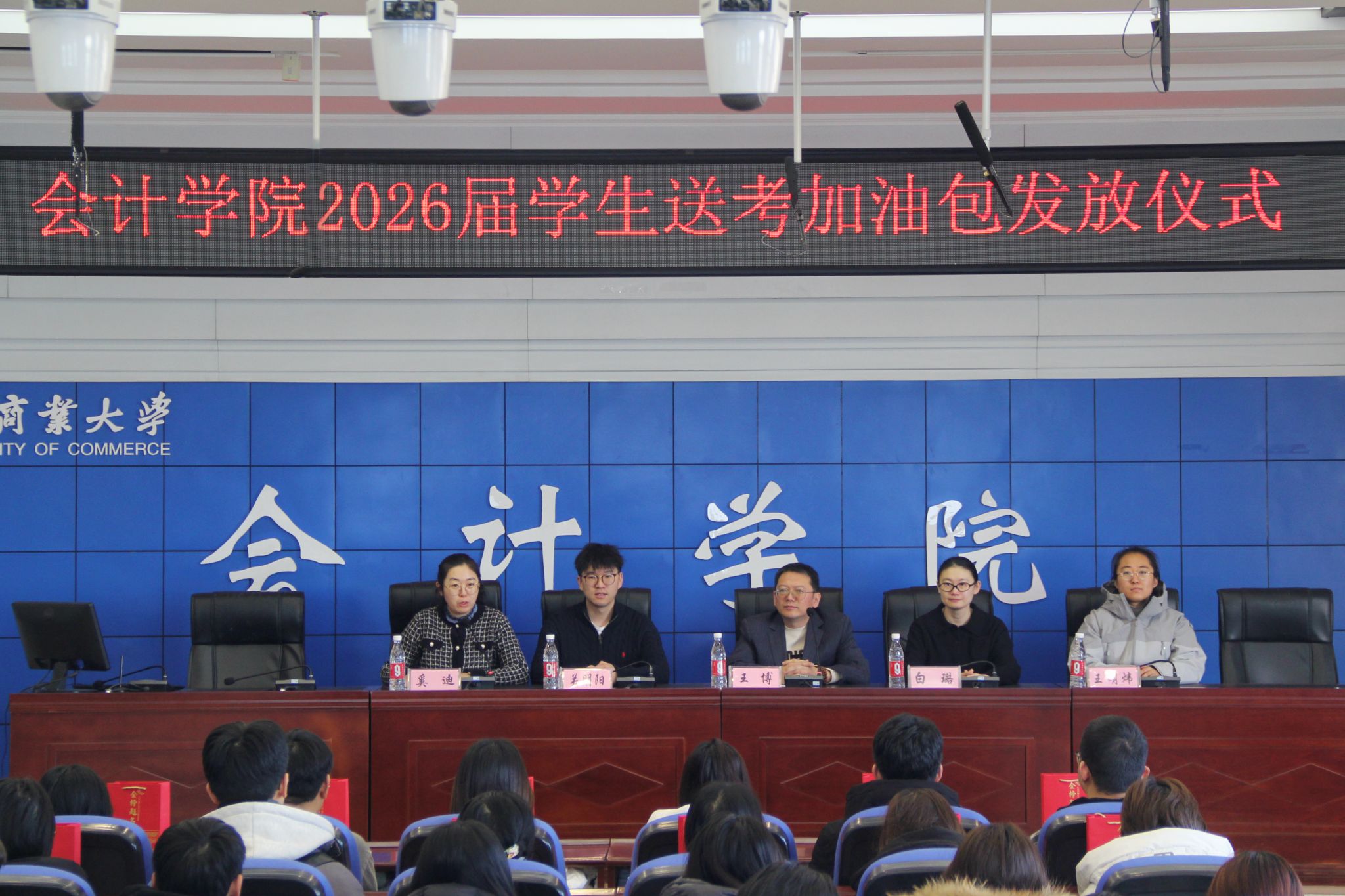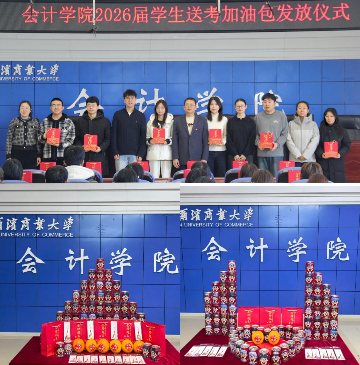 为传递学院关怀,给备考冲刺的考公、考研学生注入暖心力量,提振备考士气,鼓励学生积极应考、坚定信心,12月12日上午,会计学院举办2026届学生送考加油包发放仪式。会计学院党委副书记王博,团委书记白璐,团委副书记关明阳,2022级辅导员奚迪、王明炜参加活动。
