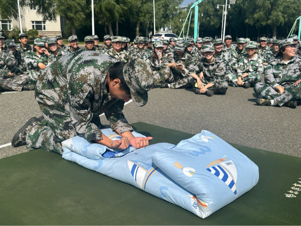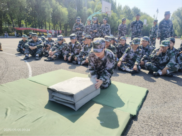 “叠被子”既是基础生活技能的传授,更是锤炼心性、培育严谨品格的重要途径。教官细致拆解“铺被、折叠、修角”等操作要领,再以实物示范讲解细节。新生们紧随节奏,在“一铺、二折、三修”的反复打磨中,原本松散的被褥逐渐变成方方正正的“豆腐块”。这一过程不仅提升了新生的动手能力,更让他们在方寸之间领悟“精益求精、一丝不苟”的内涵,将规矩意识内化于心、外化于行。
