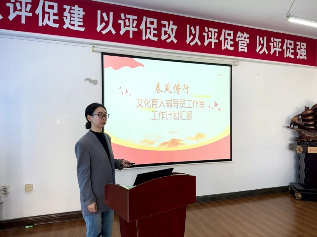 “春风偕行”文化育人辅导员工作室负责人郭菲老师做工作规划汇报,从工作室的建设理念、目标定位、人员构成、具体思路、推进路径、预期成效等方面进行了系统阐述。郭菲介绍,“春风偕行”寓意着以文化人、知行合一、春风化雨、师生偕行,工作室将立足学院学科专业特点,深度融合中华优秀传统文化、革命文化和社会主义先进文化,着力构建“价值引领+文化浸润+成长服务+文化传承”多维一体的育人模式。她表示,工作室团队将凝聚合力,努力实现提升学生人文素养、坚定学生文化自信、促进学生全面发展、打造思政工作精品的建设目标,让文化育人的“春风”吹拂到每一位学子的心田。