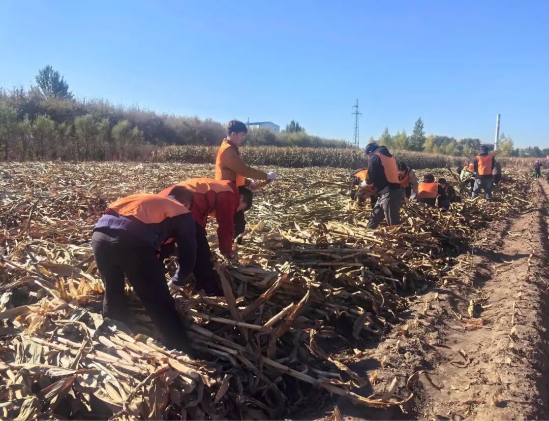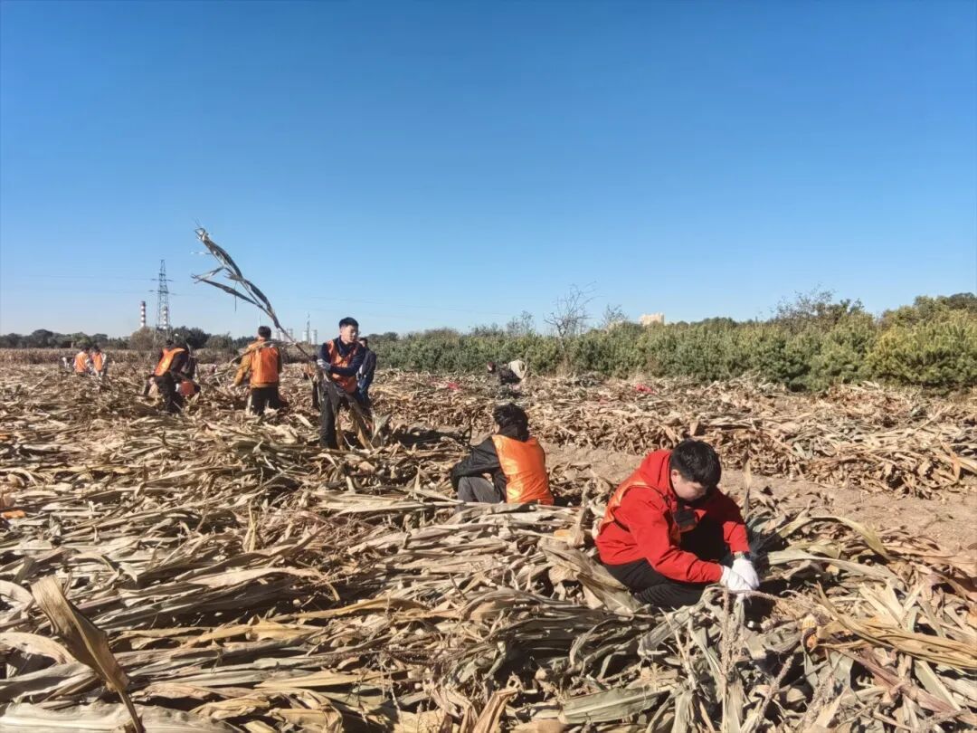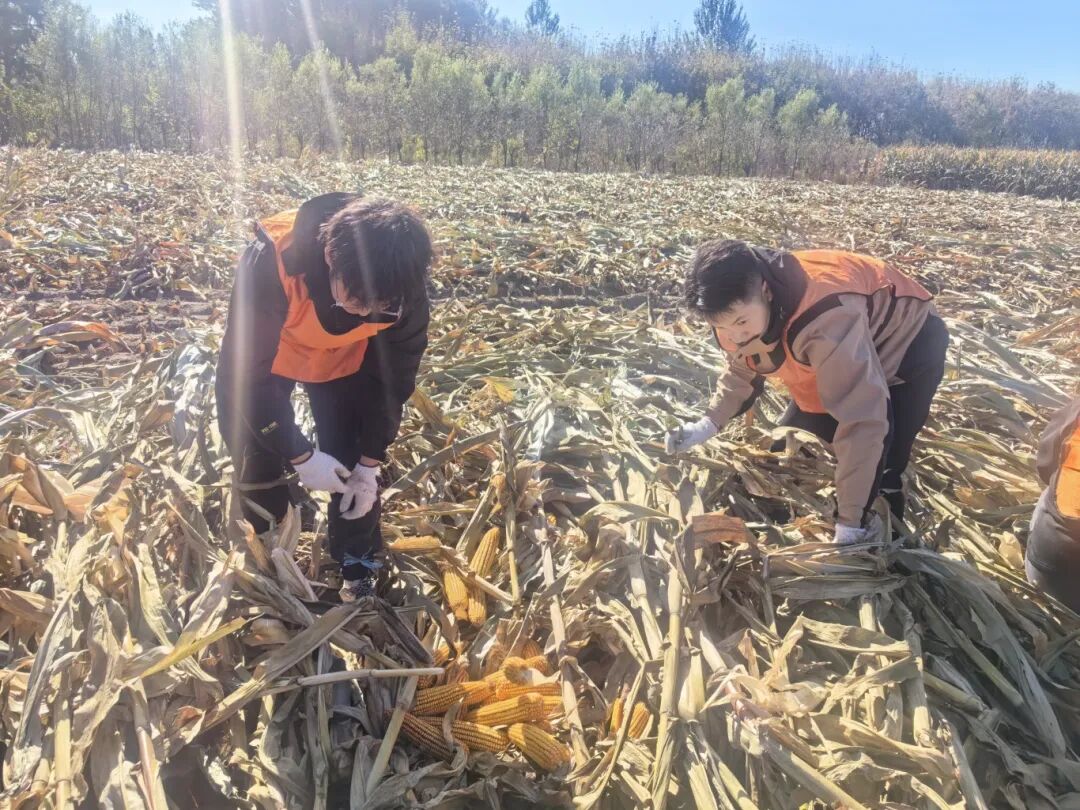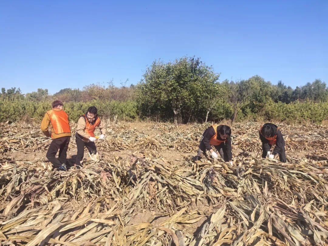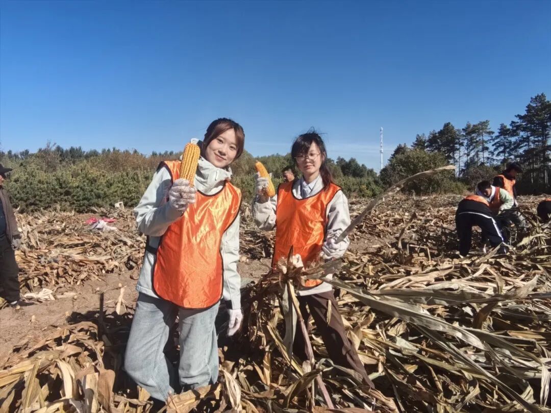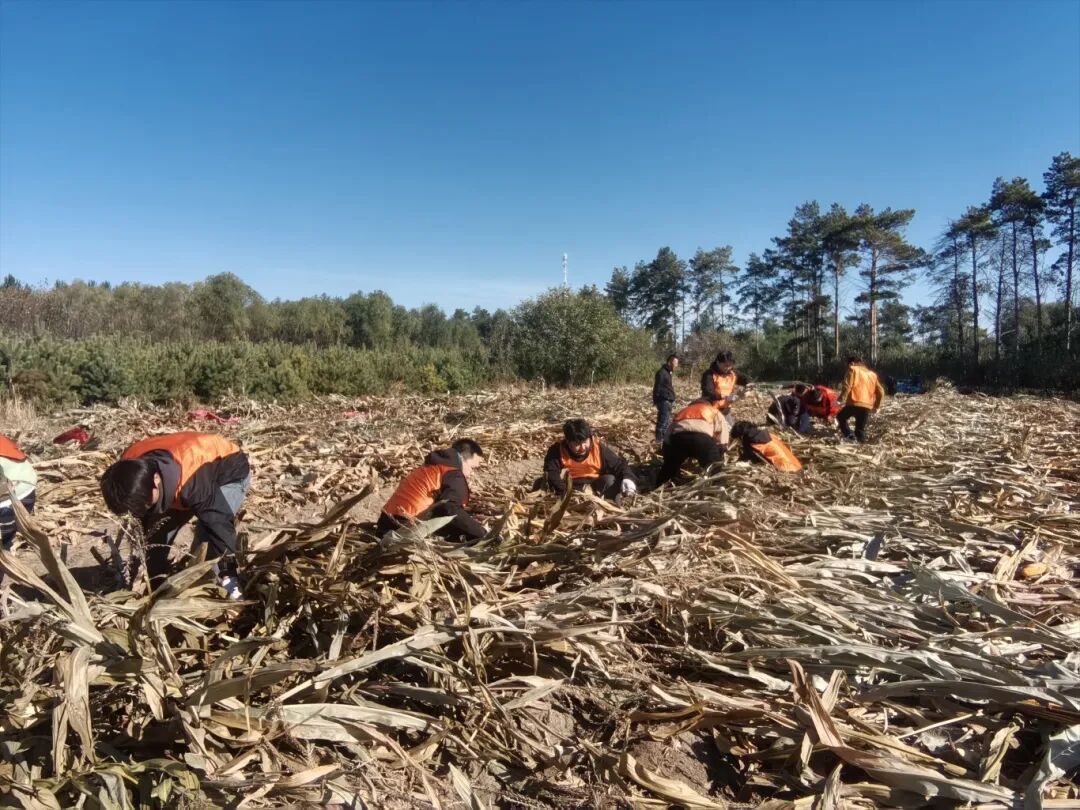 当满载着青春气息的大巴车驶入吕凤屯,映入眼帘的无边金色海洋和扑面而来的泥土芬芳,瞬间点燃了所有人的热情。在村民们的热心示范下,同学们很快掌握了掰玉米、堆秸秆的技巧,并自发组成了“生产小队”,分工协作,有人负责冲锋在前“开路”,有人负责后方运输,还有人细心地捡拾归拢散落的玉米。
