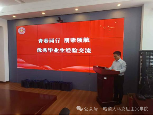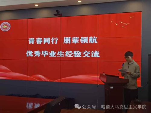 学院邀请了哈尔滨商业大学金融学院辅导员、马克思主义学院2024届毕业生李昊昕进行经验交流,他回顾了在马院求学的难忘时光,结合自身职业发展,鼓励学弟学妹们坚守专业理想,在新时代新征程中贡献青春力量。在校毕业生代表唐广虎发言,他结合自身经历,畅谈了在学院学习生活的深刻体会,表达了对母校培养的感激之情,激励毕业生们勇敢面对未来挑战。两位毕业生代表的精彩分享引发强烈共鸣,让在座的毕业生们备受鼓舞。