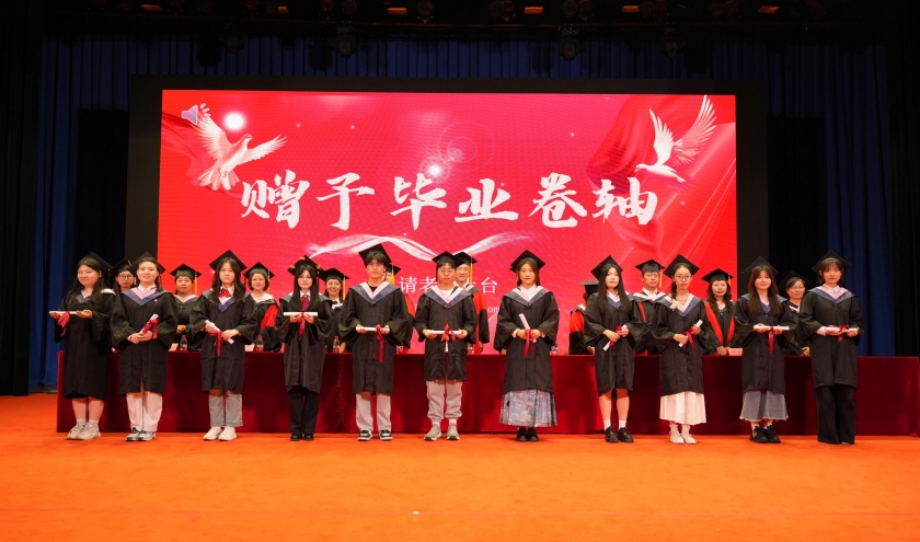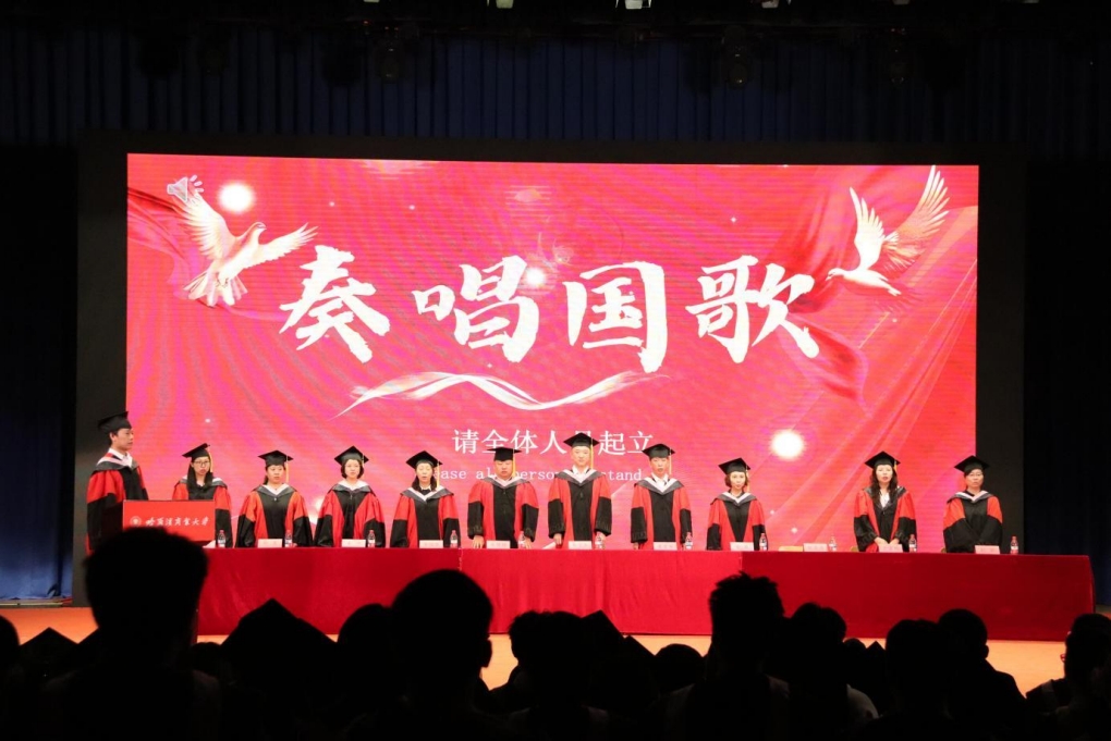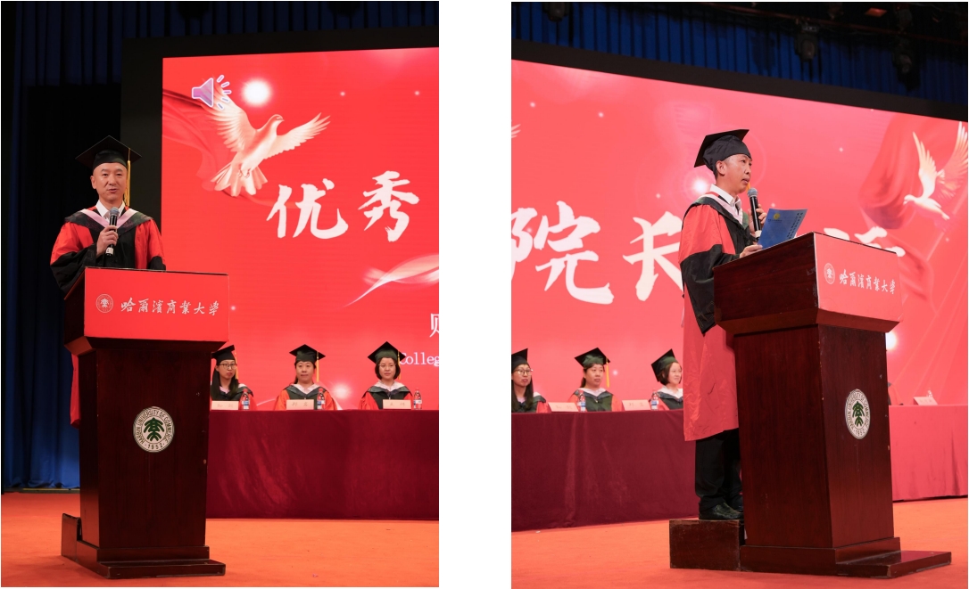 典礼伊始,2025届毕业生代表用轻快舞步诠释追梦勇气,传递逐梦决心,并温情演唱歌曲《记·念》,熟悉的旋律响起,将全场带 入对大学四年时光的深情回望。随后,全体师生奏唱国歌,典礼庄重开篇。表彰环节,学院党委书记赵宇新宣读本科、硕士优秀毕业生名单并颁发荣誉证书。现场11位学院领导及教师为374名毕业生颁授毕业卷轴,祝福学生毕业快乐。现场满满的仪式感,寄托了老师们对毕业生的殷切期望与美好祝愿。在热烈的掌声中,优秀毕业生代表、在校生代表、教师代表及优秀校友代表依次上台,分享与寄语,向即将踏上新征程的同学们赠上毕业寄语,愿同学们青衿志远,勇毅前行。学院院长景宏军带领大家回顾育人点滴,鼓励大家要持续学习,以思想为帆,以行动为浆,在新时代的浪潮中全力以赴、行稳致远。