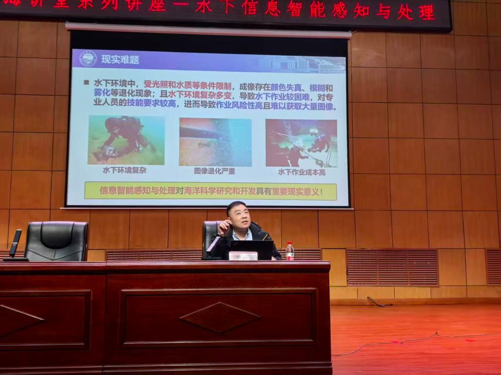 董教授指出,水下环境充满挑战,光线衰减、水流扰动导致图像退化,人类对海洋的认知仍显浅薄。讲座中董教授为学生在海洋学科与水产学科层面、团队层面以及实验项目等方面做出具体介绍。