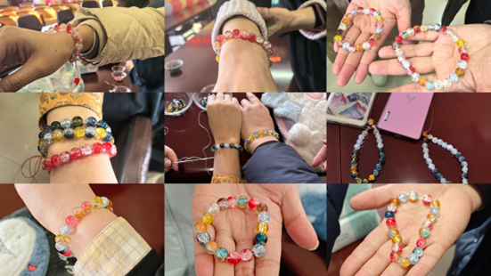 活动当天,学院精心筹备了琳琅满目的礼物。实用的洗脸巾,愿为女教师们拂去一天的疲惫;柔软的抱枕,能在休憩时给予贴心依靠,每一份礼物都承载着对女教师们深深的祝福与敬意。随后,一场别开生面的串珠活动拉开帷幕。五颜六色的珠子摆满桌面,老师们围坐在一起,挑选着心仪的珠子,开始穿起手串、挂链。在穿珠的过程中,大家相互交流、互相帮助,欢声笑语回荡在整个活动现场。还有的男老师也加入其中,感受现场热烈的氛围。一颗颗珠子在老师们灵巧的双手间串联起来,成为了一件件独一无二的艺术品,不仅串起了美好的时光,更串起了学院师生之间深厚的情谊。