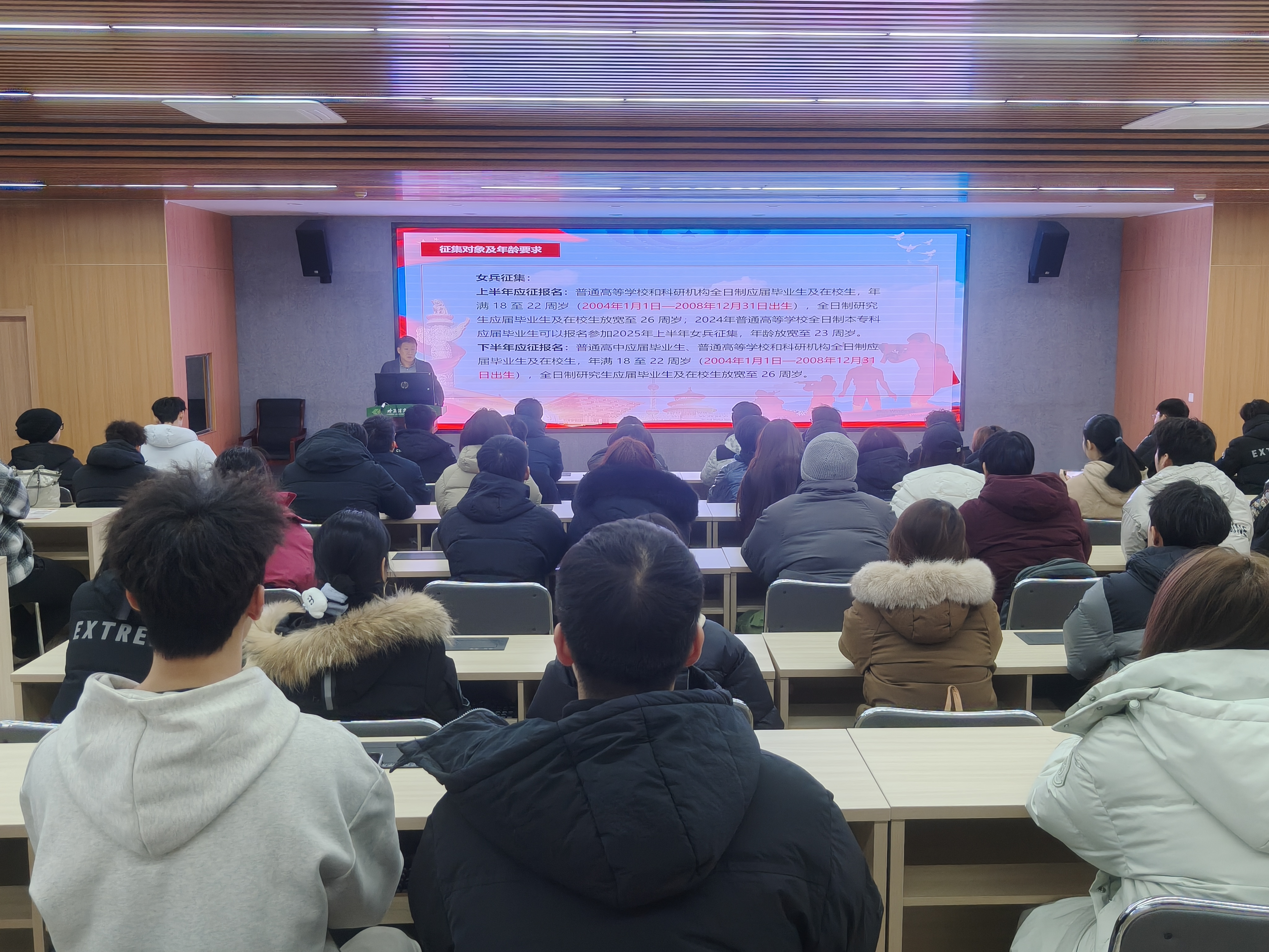 近日,我校在南、北校区分别举行了主题鲜明、气氛热烈的征兵政策宣讲会。活动旨在深入普及征兵政策,弘扬参军光荣传统,引导我校广大青年学子响应国家号召,将爱国之心化为报国之行,积极投身国防建设。此次活动标志着我校2026年征兵工作全面展开。