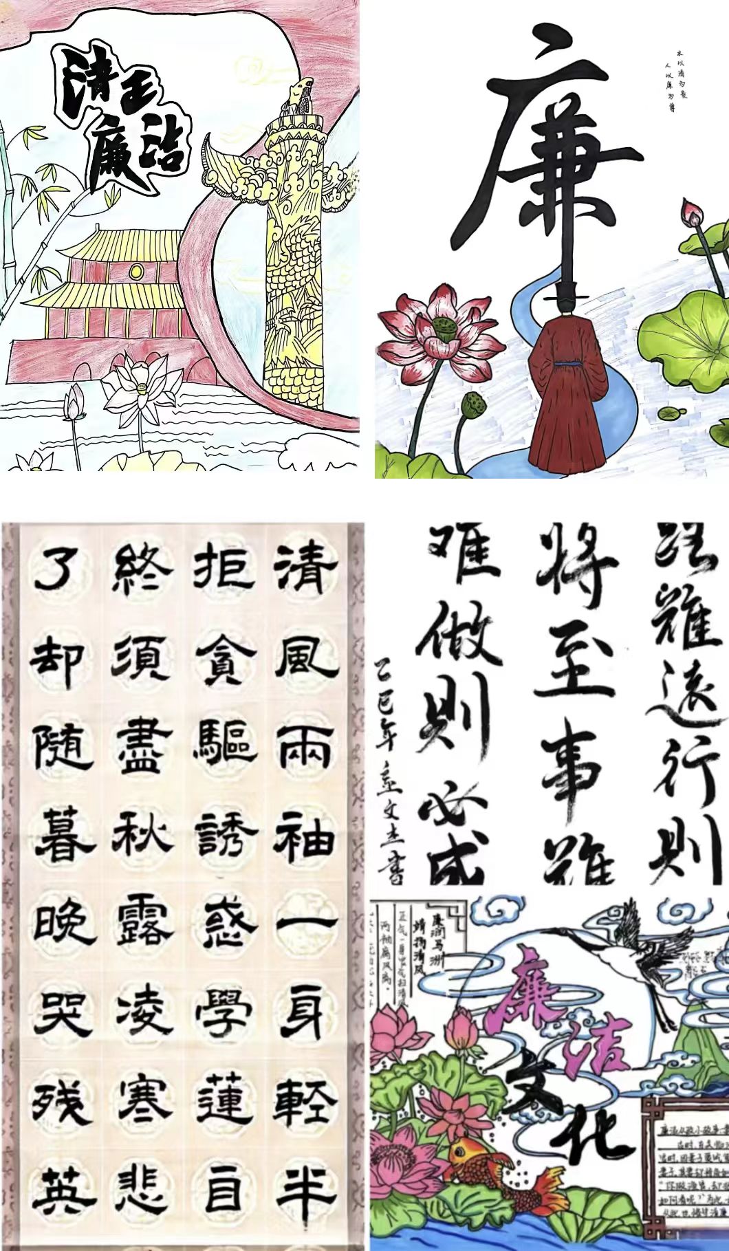 商务学院开展“廉洁文化月”主题艺术创作活动,学生们用毛笔书法、绘画、剪纸、扎染、手抄报等艺术形式,用行书传递刚正的廉洁精神,用绘画勾勒清正形象,在传承艺术形式的基础上,融入了专业特色与时代精神,传递出对廉洁文化的坚守与传承。