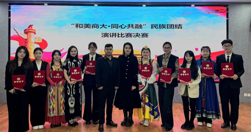 以“言”明志,凝聚行动共识。“和美商大·同心共融”民族团结演讲比赛圆满落幕,10名选手晋级决赛,他们身着特色民族服饰,结合亲身经历讲述民族团结故事,以真挚情感与生动语言诠释了铸牢中华民族共同体意识的时代内涵。比赛以“以赛促融”的形式,为学子搭建思想交流平台,既展现中华文化的多元魅力,更将民族团结意识融入师生心灵,为构建“和美商大”注入了精神动力。