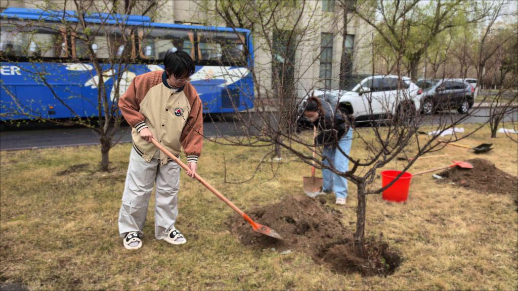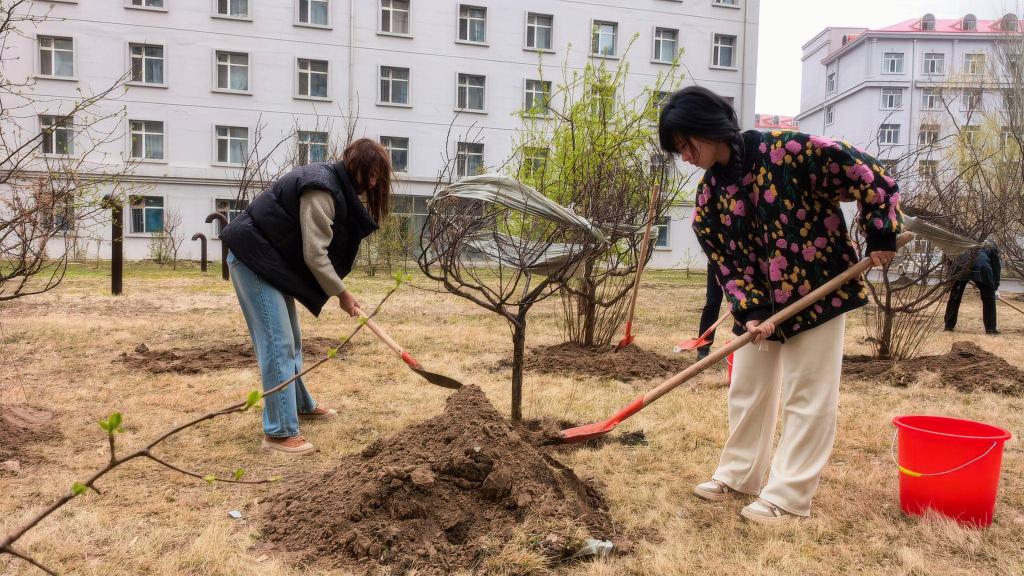 工作人员分组领取樱桃、丁香等树苗,有序开展种植。铁锹起落间,树坑渐次成型;协作配合中,树苗稳稳扎根。来自财政与公共管理学院的学生志愿者邹昕芮说:“平时在课堂上学习生态保护,今天亲手建设生态,看着小树挺立在校园里,好像也种下了自己对绿色未来的期待。”