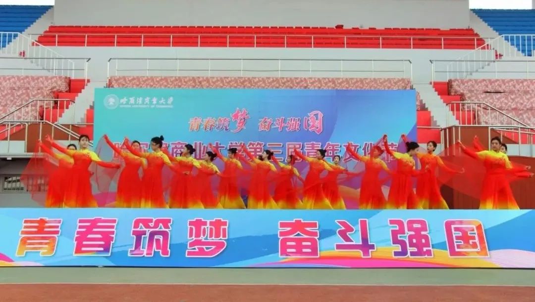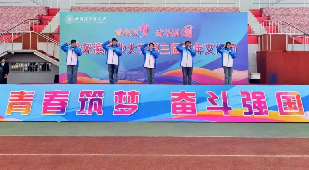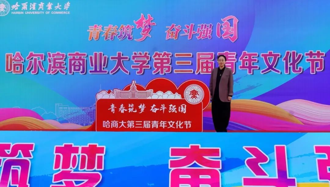 校团委书记焦晋鹏为“青春筑梦 奋斗强国”哈商大第三届青年文化节揭幕。