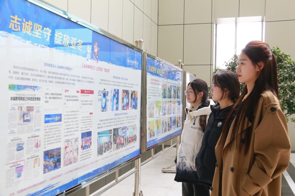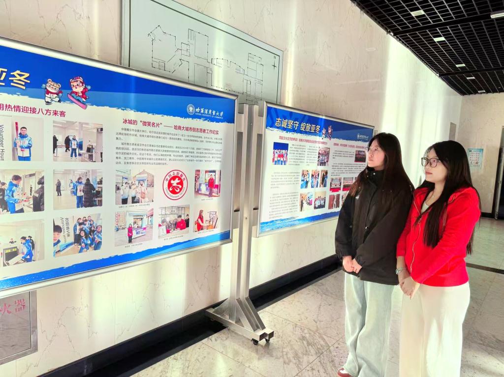 南北校区宣传栏前,师生们时而驻足凝思,时而轻声议论,为志愿者们全力保障、高效服务、不畏严寒、无私奉献的工作素养而赞叹不已。教学楼内,往来师生沉浸式感受着亚冬盛会向全世界展现的中国形象与大国担当。透过图片,大家深刻体会到,在传递更真实、更友爱、更具活力的 “大国温度”背后,有商大师生贡献的一份坚实力量。