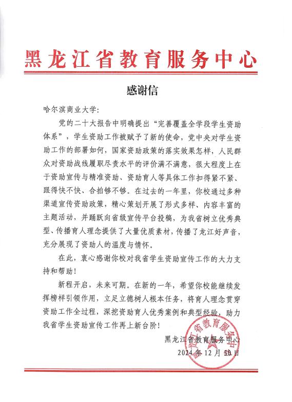 近日,省教育服务中心向我校发来感谢信,对我校过去一年资助工作提出表扬。信中表示,哈尔滨商业大学扩展资助政策的宣传渠道,积极开展丰富多彩资助育人活动,为我省优秀典型选树提供了有力支持,传播了龙江好声音,充分展现了学校资助工作风采。