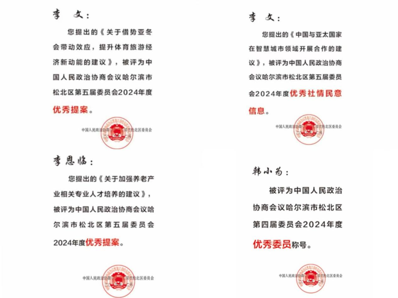 2024年12月30日,哈尔滨市松北区五届人大四次会议和松北区政协五届四次会议在全总(哈尔滨)劳模技能交流基地召开。我校区人大代表张小锋,区政协副主席李恩临,区政协常委李文,区政协委员唐宝盛、韩小为、王征宇提交了《关于治理学海街哈商大门前商贩占道问题建议》《关于我区实施科技企业分级制度的建议》《关于加强党外代表人士队伍建设的建议》《关于降低松北区居民生活饮用水中钙镁离子含量的建议》《关于加强住宅小区电动车管理的建议》《促进松北区文化与旅游融合发展的建议》等10份内容丰富、涵盖广泛的议案提案。张小锋提出的《关于丰富松北区基础设施投资渠道的建议》被评为“优秀建议”,李恩临提出的《关于加强养老产业相关专业人才培养的建议》荣获2024年度“优秀提案”,李文提出的《关于借势亚冬会带动效应,提升体育旅游经济新动能的建议》荣获2024年度“优秀提案”,李文提出的《中国与亚太国家在智慧城市领域开展合作的建议》被评为2024年度“优秀社情民意信息”,韩小为被评为2024年度“优秀委员”。李文接受哈尔滨新区发布等媒体采访,多家媒体转载报道。